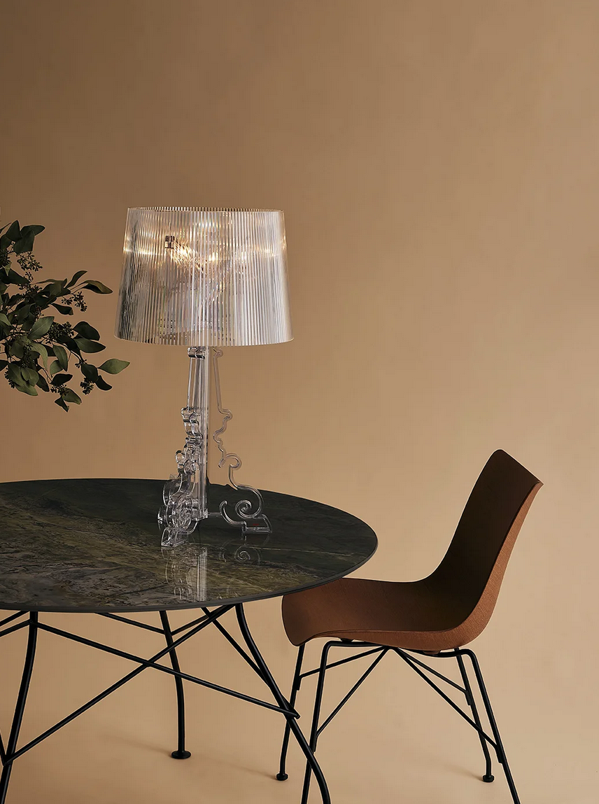 Bourgie allie classicisme, richesse et tradition à l’innovation technologique. Le pied, de style baroque, se compose de trois niveaux décorés qui s’entrecroisent, tandis que le grand abat-jour paré d’un effet plissé crée un jeu de mille reflets quand la lampe est allumée. Grâce au système spécial de fixation de l’abat-jour, il est possible d’obtenir trois hauteurs différentes, qui peuvent être modifiées au gré de vos envies en fonction de l’utilisation prévue : 68, 73 et 78 centimètres.