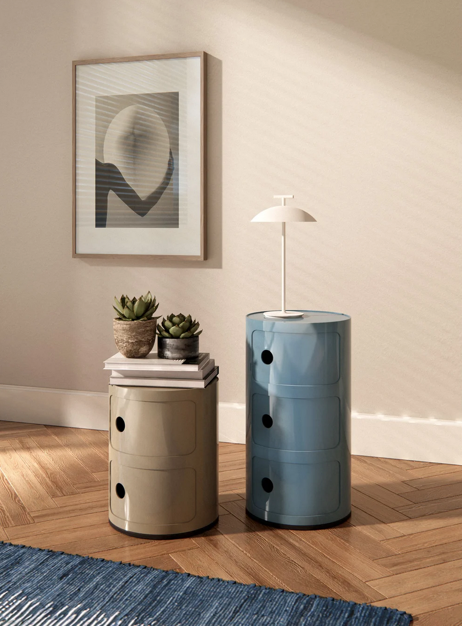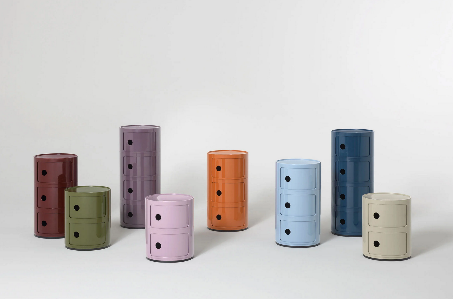 Les éléments Componibili ont été conçus afin de répondre à diverses exigences d’utilisation et pour trouver place dans toutes les pièces de la maison. Créés en 1967, les Componibili sont un classique intemporel du mobilier proposés, aujourd’hui, sous une forme ronde d’un diamètre de 32 cm. Fonctionnels et pratiques, ils trouveront leur place dans tous les espaces grâce à leurs compositions fixes comprenant deux, trois et quatre éléments. Ce modèle est décliné dans six finitions scintillantes et une finition argent mat.