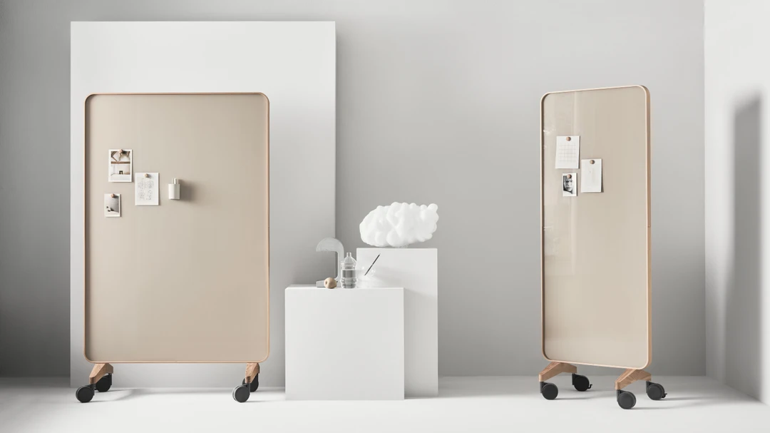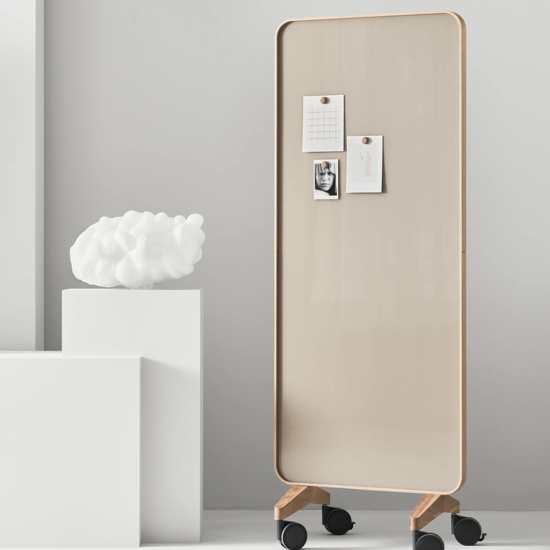 Tableau d’écriture en verre double face sur roulettes avec cadre en bois courbé. Le cadre encercle la surface d’écriture dont il dessine clairement les contours. Il fait également office de poignée permettant de déplacer le tableau d’un endroit à l’autre.