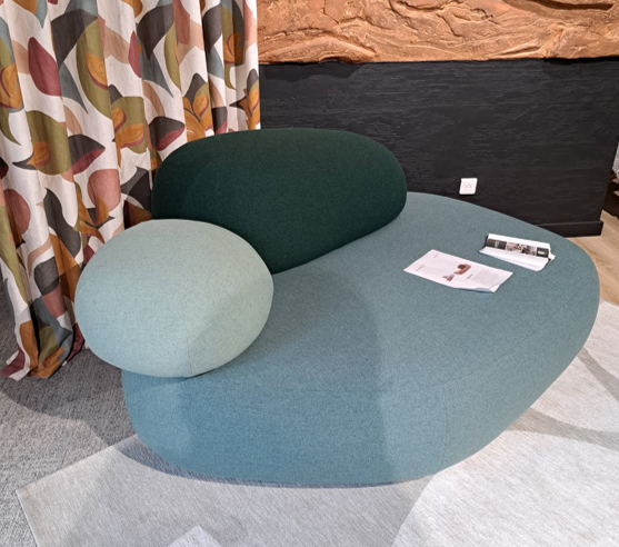 Rembourrage mousse polyuréthane à densité variable, structure interne en bois, revêtement tissu Tonica 2 : Assise bleu-vert – Grand dossier coussin vert bouteille – Petit dossier coussin vert d’eau